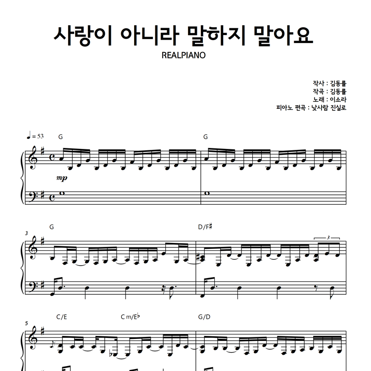 [ 이소라 - 사랑이 아니라 말하지 말아요 (쉬운키 G) ] 피아노 악보입니다.