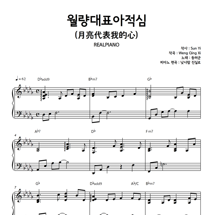 [ 등려군 - 월량대표아적심 (원키 Db) ] 피아노 악보입니다.