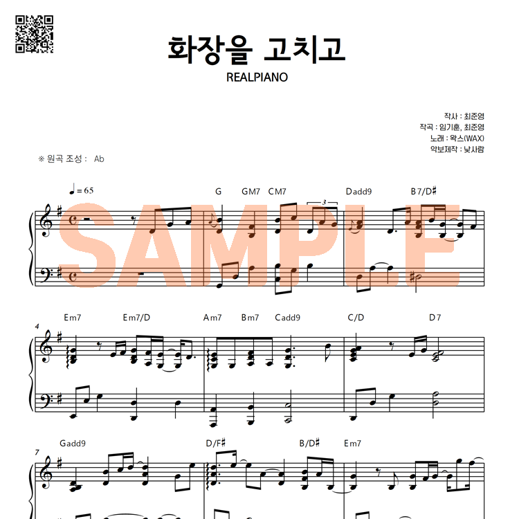왁스 - 화장을 고치고 (쉬운키 G) 피아노 악보입니다.