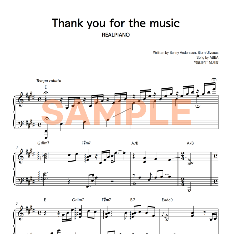 [ ABBA - Thank you for the music (원키 E) ] 피아노 악보입니다.