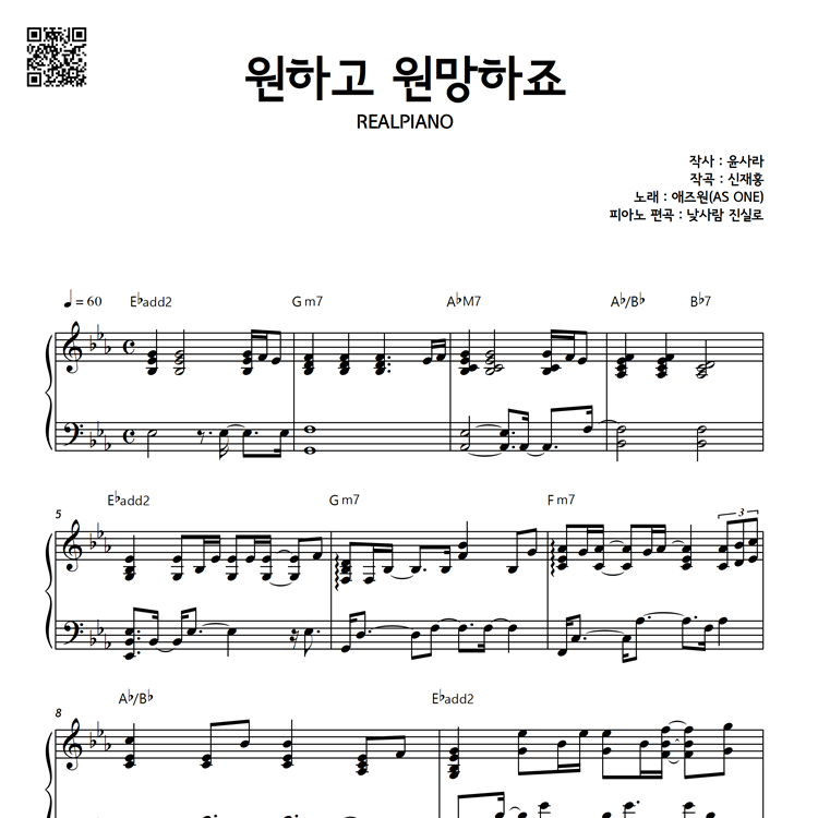 [ 애즈원(As One) - 원하고 원망하죠 ] 피아노 악보입니다.